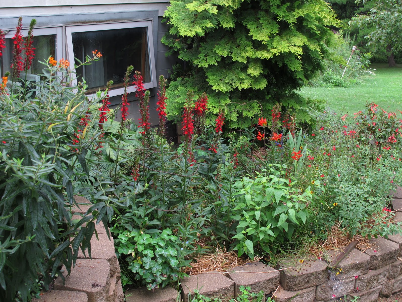 My cardinalflower Lobelia cardinalis bed, with some Salvia guaranitica "Black and Blue" and Salvia greggii "Cherry Chief" and Fuchsia "Gartenmeister Bonstedt" and Crocosmia "Lucifer" thrown in for fun and hummingbird appeal.